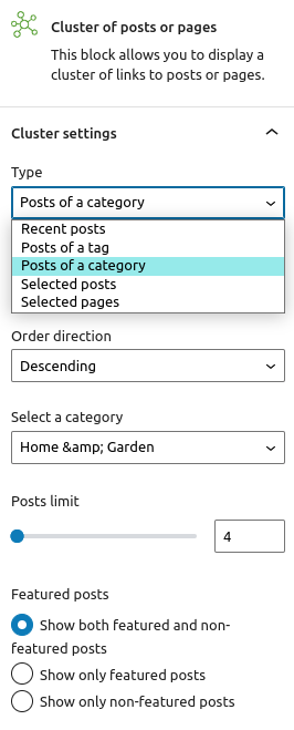 This block allows you to display a grid of categories with their featured posts. It also allows to hide the highlighted entries, as well as to show only sister categories of the current post’s category, subcategories of the current post’s category, as well as to exclude specific categories or subcategories.